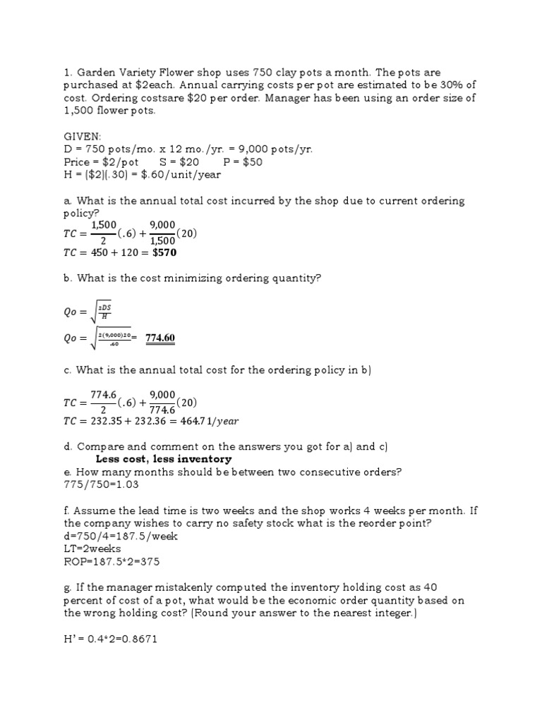 Ch13 Tutorial Solution Ch13 Tutorial Solution 1 Garden Variety Flower Shop Uses 750 Clay Pots A Month The Pots Are Purchased At 2 Each Annual Course Hero